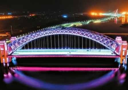 汾河三期是汾河景區的南延工程,北起龍城大街祥云橋南500米,南至迎賓橋南2公里,全長12公里。夜景景觀亮化工程是大橋的施工重點,為了將這幾座橋梁打造成市民鍛煉、休閑娛樂的好去處,施工人員佩戴安全防墜器在拱圈內外設置景觀燈帶,夜晚主塔好比一塊玉璧,與主纜上的珠簾形成珠聯璧合的意境。